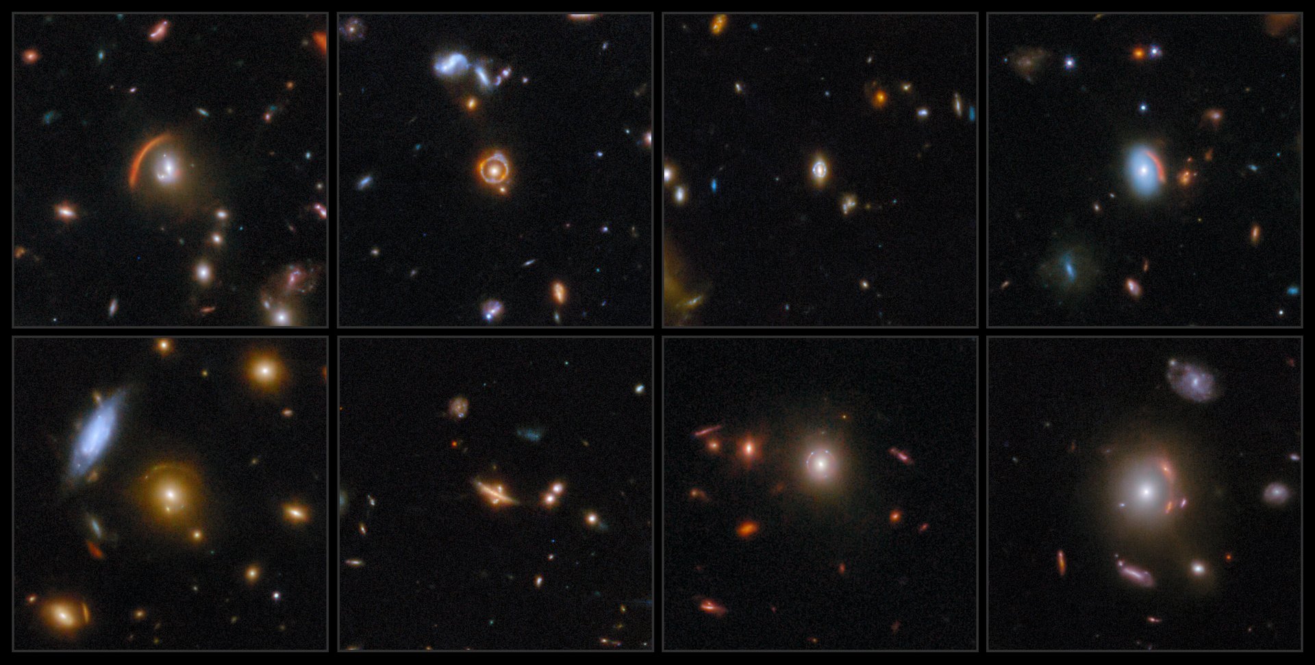 This ESA/Webb Picture of the Month shows eight stunning examples of gravitational lensing. Gravitational lensing, which was first predicted by Einstein, occurs because massive objects like galaxies and clusters of galaxies dramatically warp the fabric of spacetime. When a massive foreground object lines up just so with a background galaxy, the light from the background galaxy bends as it navigates the warped spacetime on its way to our telescopes.