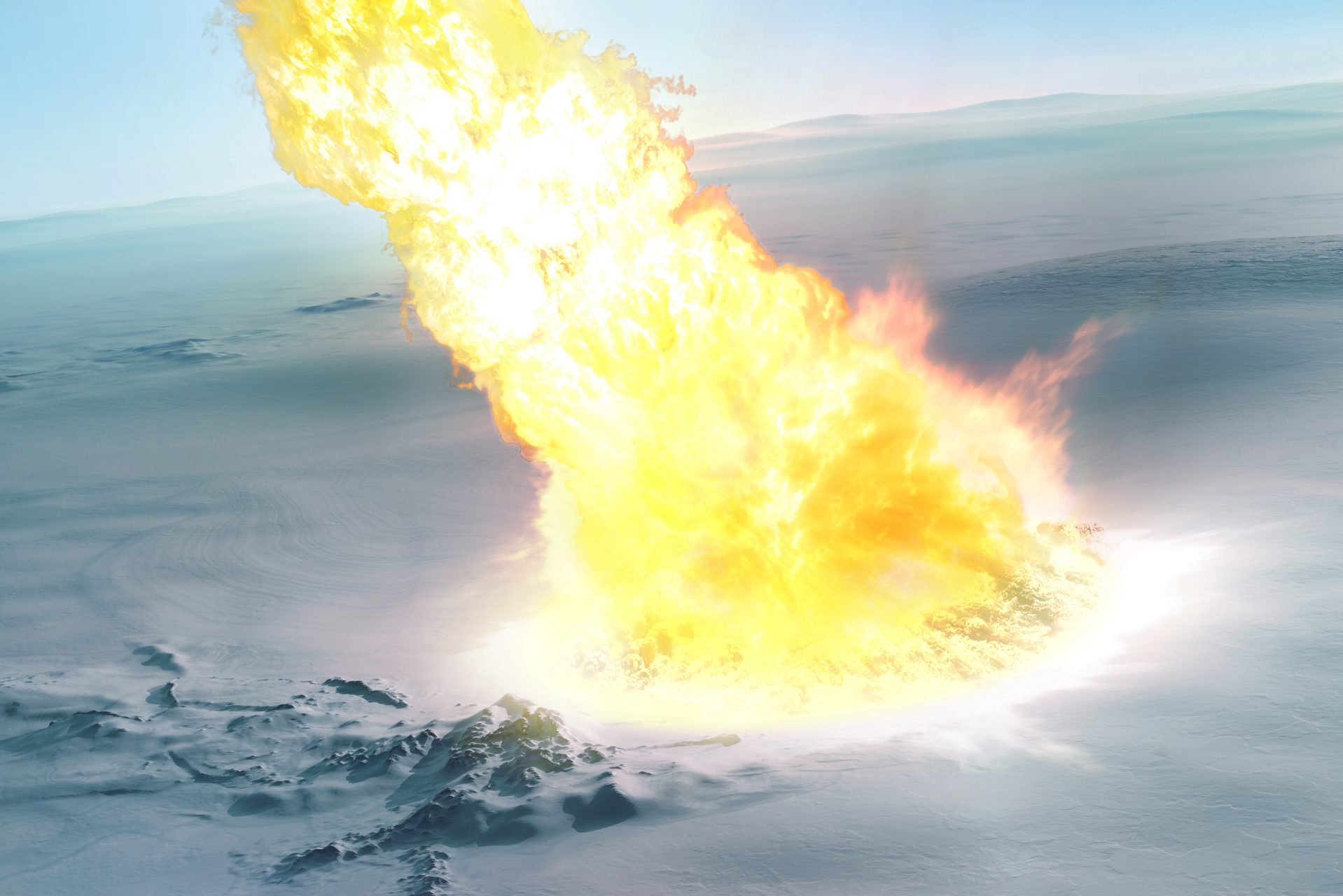 Lead image caption: Mocked up illustration of touchdown impact on Antarctica by Mark A. Garlick