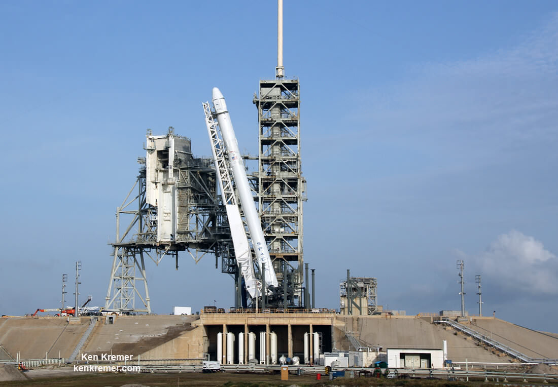 SpaceX Falcon 9 rocket goes erect to launch position atop Launch Complex 39A at the Kennedy Space Center on 1 Jun 2017 as seen the morning before later afternoon launch from inside from the pad perimeter. Liftoff of the CRS-11 resupply mission to the International Space Station (ISS) slated for 1 June 2017. Credit: Ken Kremer/Kenkremer.com[/caption]