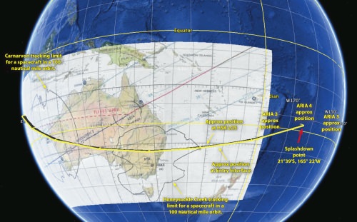 An approximate representation of Apollo 13's re-entry groundtrack. Click the image for access to a larger pdf version. [/caption]