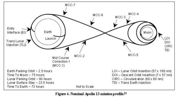 An employee of TRW – which was the contractor for many of the navigational systems and procedures for NASA -- thought of an unusual backup navigation plan one day. "This fellow is a friend and neighbor of mine," said Woodfill, "and by his account of the story to me, he said that a thought came to him one day about Apollo astronauts using stars to navigate. What if the stars couldn't be seen? Now, that was highly unlikely, as there are no clouds, fog, or smoke to conceal stars from viewing by astronauts. But, nevertheless, the thought simply wouldn't cease. Soon a follow-up idea came to mind. Why not use the Earth's terminator?" [caption id="attachment_62850" align="aligncenter" width="580" caption="The nominal flight plan for a mission to the Moon. Credit: Apollo 13 report."]
