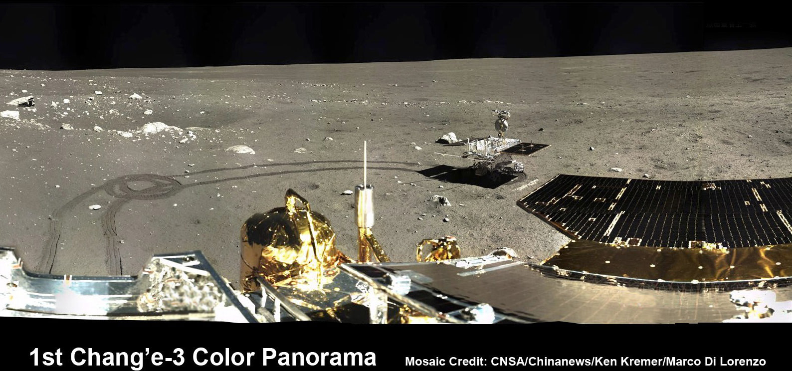 1st 360 Degree Color Panorama from China's Chang'e-3 Lunar Lander This 1st color panorama from Chang'e-3 lander shows the moonscape view all around the landing site after the 'Yutu' lunar rover left impressive tracks behind when it initially rolled all six wheels onto the pockmarked and gray lunar terrain on Dec. 15, 2013. Mosaic Credit: CNSA/Chinanews/Ken Kremer/Marco Di Lorenzo – kenkremer.com[/caption]