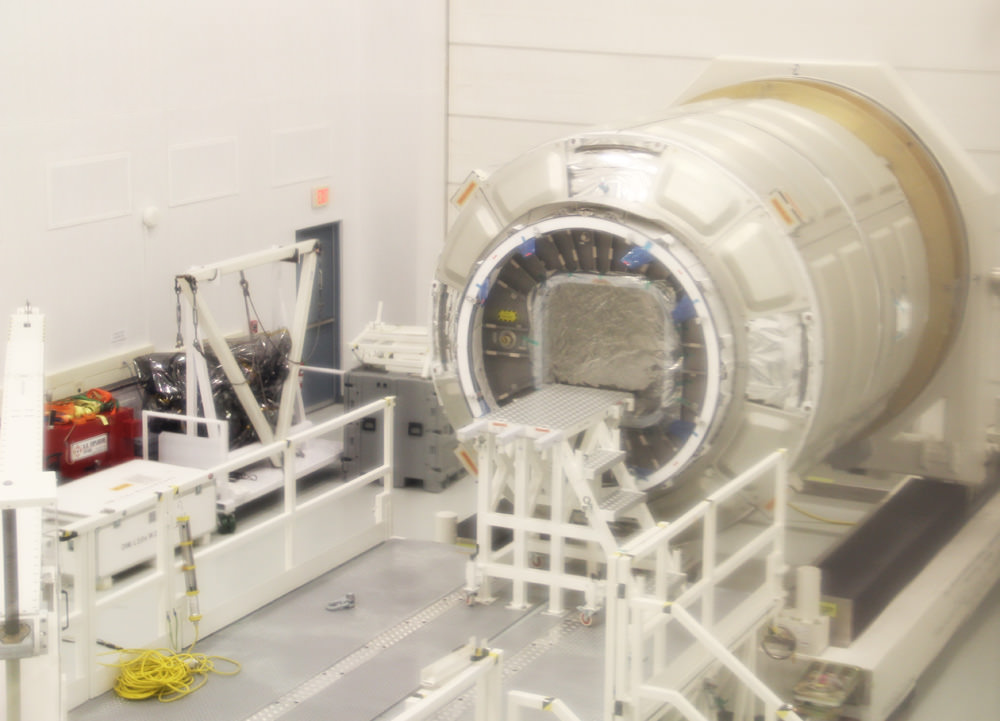 Universe Today took an exclusive look at the unmanned Cygnus cargo carrier housed inside the high bay facility where the vehicle is being processed for flight during a visit