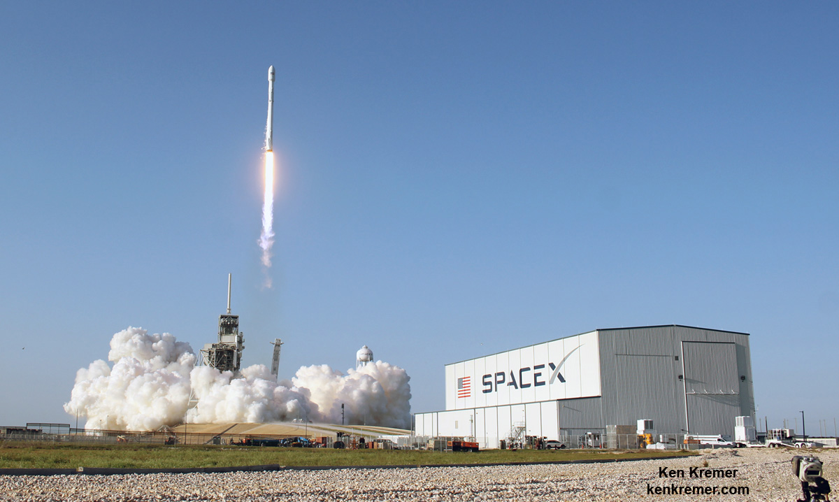 SpaceX Falcon 9 and SES-10 Satellite rising higher, picking up speed at Kennedy Space Center Launch Complex 39 on March 30, 2017 - as seen from KSC Visitor Complex Apollo/Saturn Center. Credit: Carol Higgins[/caption]