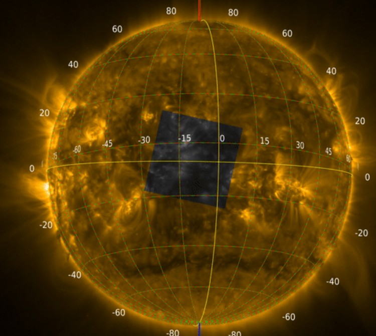 *The grey region shows the 5x5 grid in one position on the Sun's surface. Image Credit: ESA & NASA/Solar Orbiter/EUI Team, D. Berghmans (ROB) LICENCE CC BY-SA 3.0 IGO*