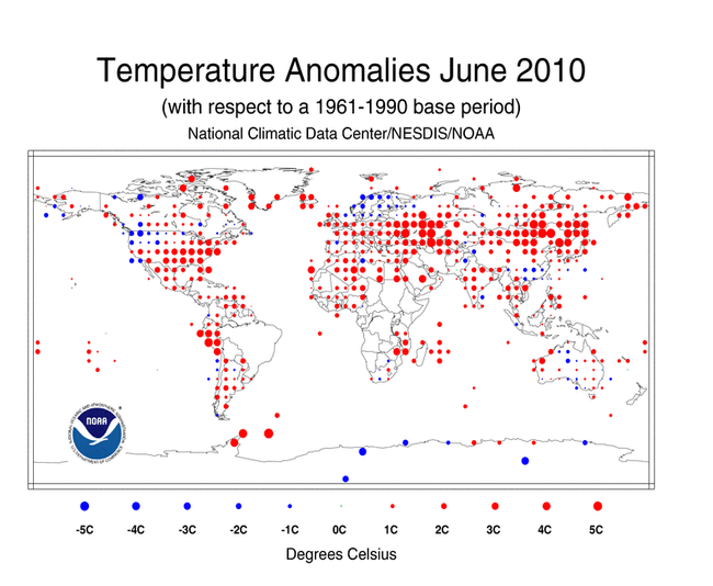 The combined global land and ocean average surface temperature for June 2010 was the warmest on record at 16.2°C (61.1°F), which is 0.68°C (1.22°F) above the 20th century average of 15.5°C (59.9°F). The previous record for June was set in 2005.