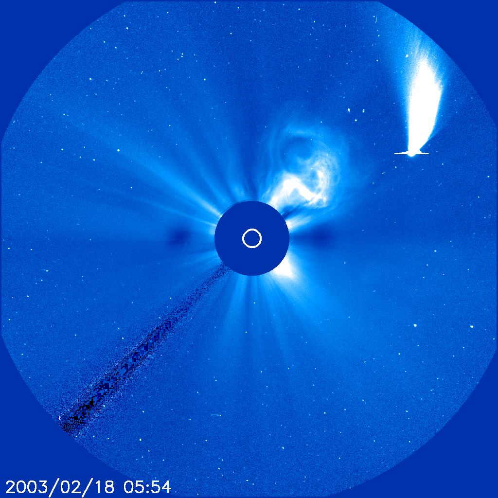 The second one shows a CME reaching out towards comet C/2002 V1 (NEAT) back in 2003. "This was a rare instance where the CME actually passed right over the comet and we saw a little interaction between the CME and the comet tail," Battams said during the AMA. "CMEs are entirely harmless to comets structurally, but the magnetic field embedded in them can mess around with dust in the comet tails."