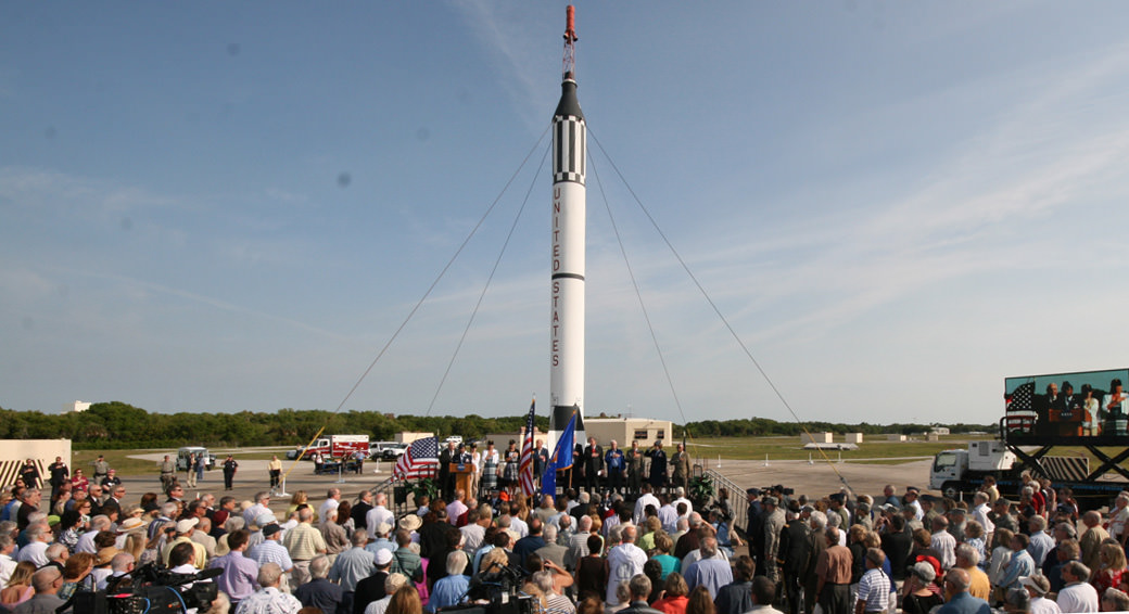 entire 15 ½ minute suborbital spaceflight aboard the "Freedom 7" capsule was replayed in a multimedia audio and video presentation that was projected on a Jumbotron erected off to the side of an 82 foot tall replica of his Mercury-Redstone 3 rocket.