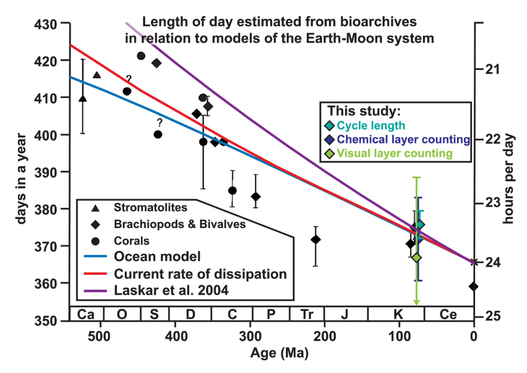 In their paper the authors write, "A combination of layer counting, spectral analysis of chemical cyclicity and chemical layer counting shows that the rudist precipitated 372 daily laminae per year, demonstrating that length of day has increased since the Late Cretaceous, as predicted by astronomical models."