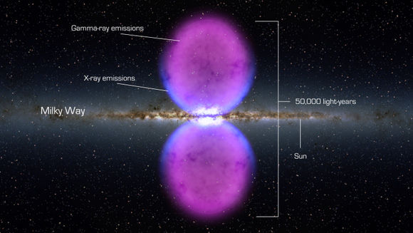 "What we see are two gamma-ray-emitting bubbles that extend 25,000 light-years north and south of the galactic center," said Doug Finkbeiner, an astronomer at the Harvard-Smithsonian Center for Astrophysics in Cambridge, Mass., who first recognized the feature. "We don't fully understand their nature or origin."