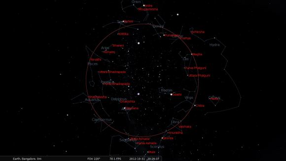 Two names were derived from the ancient Hindu lunar mansions as well. These stars are Revati and Bharani, which designate Zeta Piscium and 41 Arietis, respectively. In addition to being a lunar mansion, Revati was also the daughter of King Kakudmi in Hindu mythology and the consort of the God Balarama - the elder brother of Krishna. On the other hand, Bharani is the name for the second lunar mansion in Hindu astronomy and is ruled by Shurka (Venus).