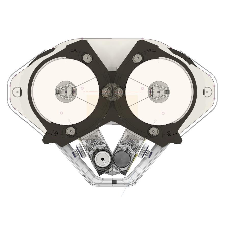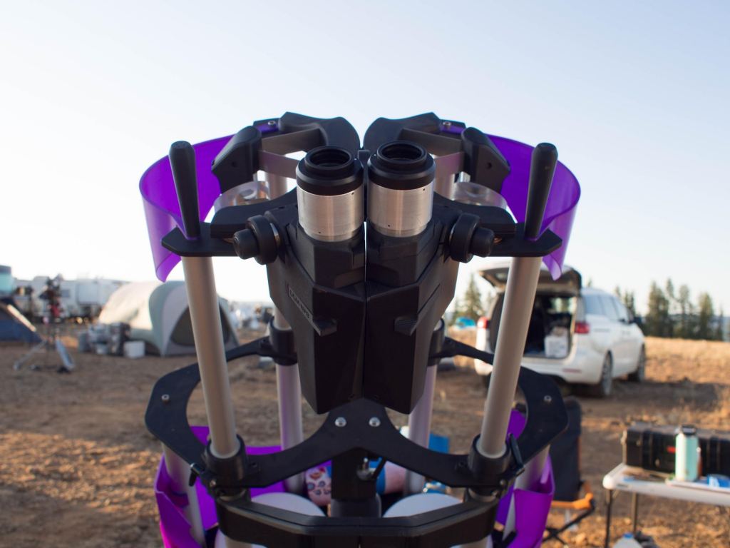 Really though, the Drifter's biggest breakthrough is the ability to share the views. This scope is an outreach beast. I have two young kids and love doing public star parties, so I really wanted to be able to share these views with everybody. Different people have different PD (pupil distance) between your eyes. With handheld binoculars everyone knows you just pull the eyepieces apart to fit your head, but this hasn't been the case with binoscopes. There's usually a fiddly set of knobs nobody understands in the dark, and then this changes the focus so you have to refocus for each person. Then people grab the eyepieces and try to move them anyhow, which throws the alignment out and the scope is down for half an hour. Look, people want to grab the eyepieces and move them, so let's make that the way we adjust PD.