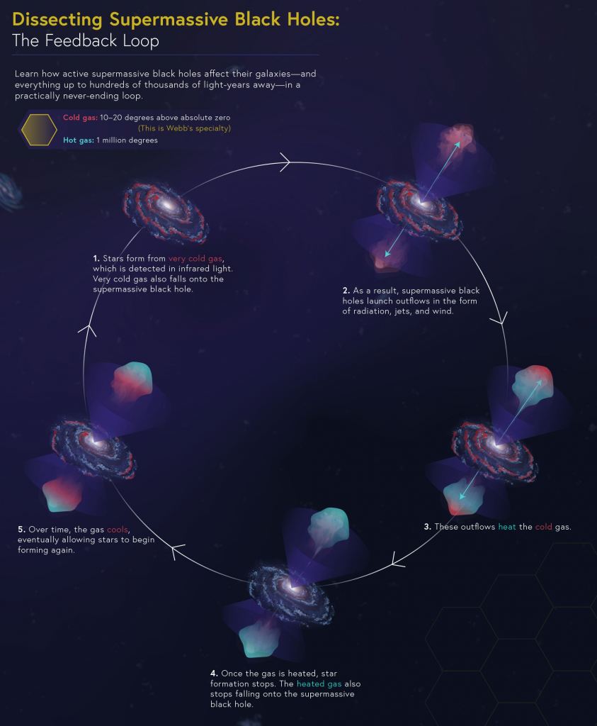 Sometimes a black hole will reheat the surrounding gas preventing stars from forming. That's called black hole feedback, and it happens when black holes emit jets of heated material from their centers. The jets are enormously powerful, pushing away the hot x-ray-emitting gas in the galaxy cluster's center, creating vast radio bubbles.