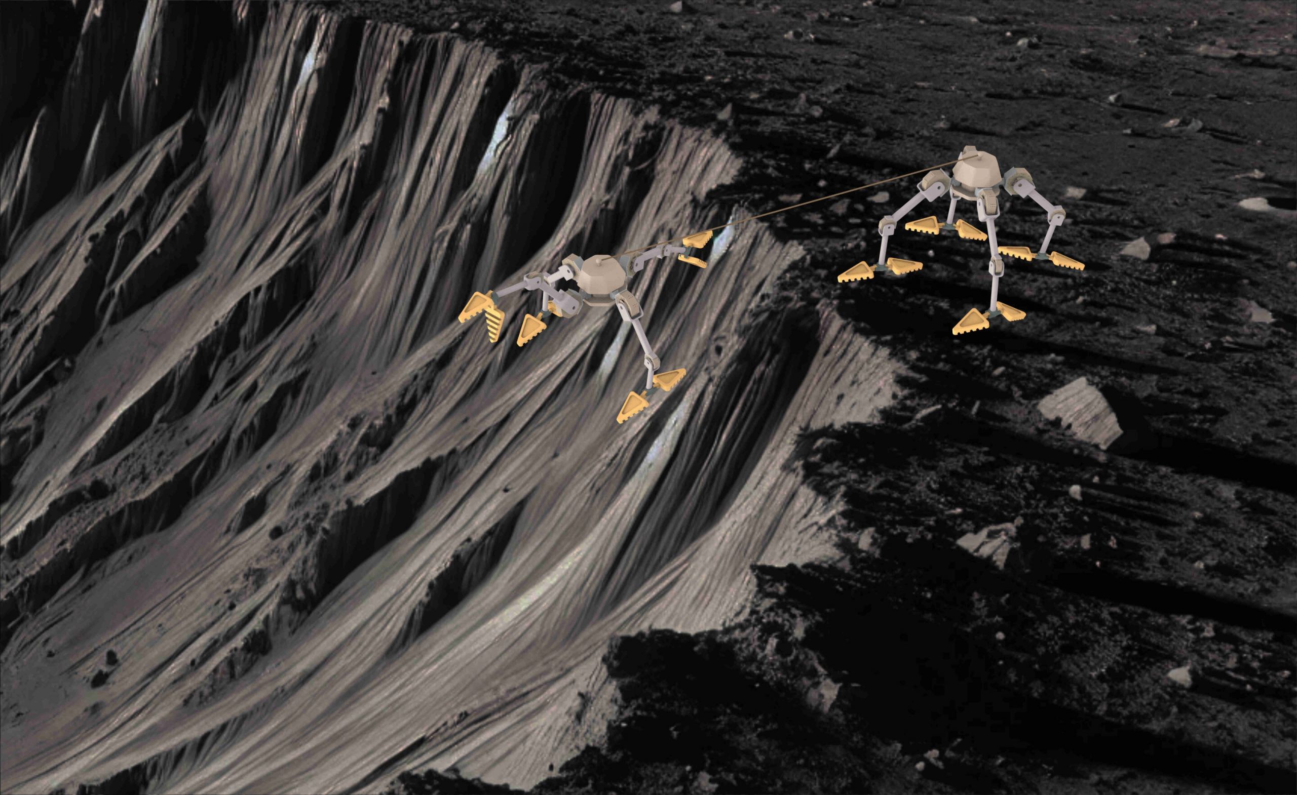 Depiction of one SPLITTER robot descending into a crater while the other anchors on the rim.