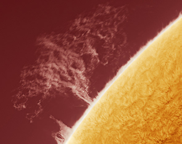 An enormous tree-shaped prominence spreads its "branches" tens of thousands of miles above the Sun's photosphere in this image, a section of a photo acquired in hydrogen alpha (Ha) by Alan Friedman last week from his backyard in Buffalo, NY.
