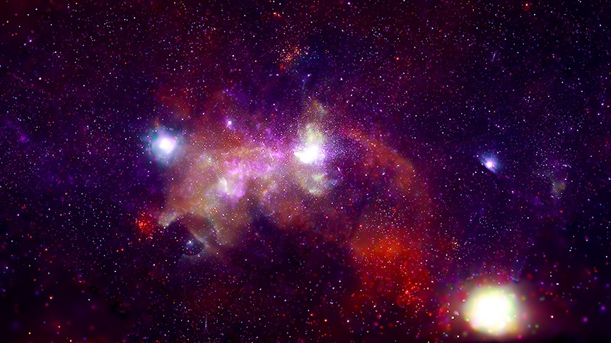 26,000 light-years away lies the very heart of the Milky Way Galaxy. This is a dense, energetic region of space, crowded with stars and superheated gas. Hiding in the centre of it all is a supermassive black hole called Sagittarius A. The orange, green, blue, and purple colors in the image each represent a different frequency of X-rays captured by the Chandra X-Ray Observatory.