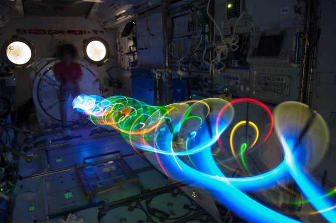 The project, JAXA added, is "designed to produce aurora-like luminescence traces using a spinning top with both linear and point light sources. In microgravity, the center of gravity of the spinning top continuously and randomly moves while it is spinning. Using the characteristics of the top in microgravity, the project tries to produce various light arts using its unexpected movements/spins, by changing attaching locations of its arms and weights."