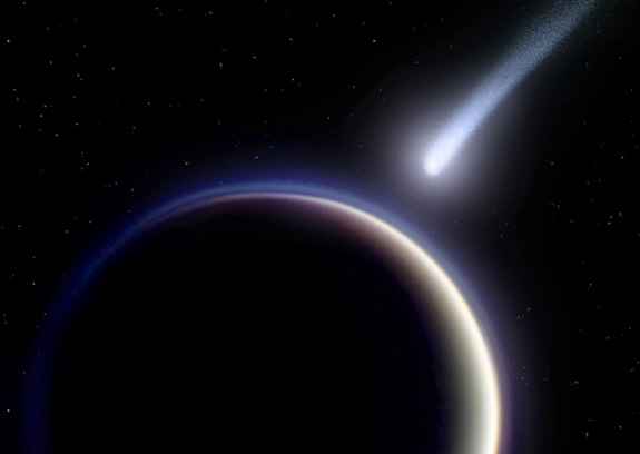 Note: the image at top is not scientifically accurate...the comet's tail would be, based on the lighting of Titan, pointing more to the ten o'clock position as well as forward toward the viewer's left shoulder. This would make it 'look' as if it were going the opposite direction though, away from Titan, and so I went with the more immediately decipherable version seen here. To see a more "realistic" version, click here.
