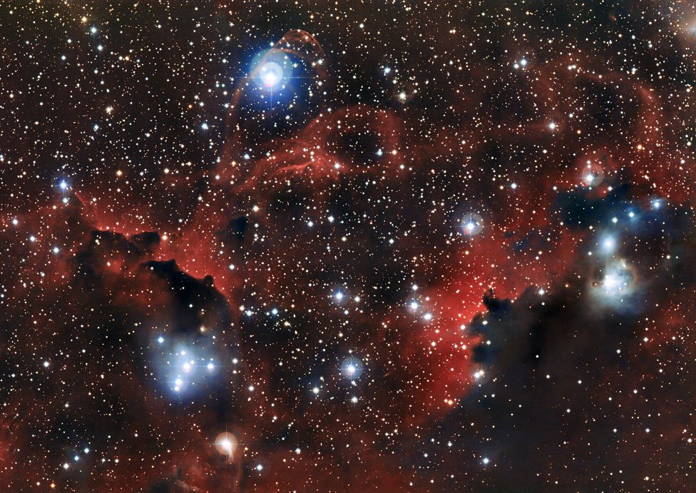The silhouettes of dark, dense clouds closer to Earth block the red hydrogen glow from more distant areas of Sharpless 2-296.