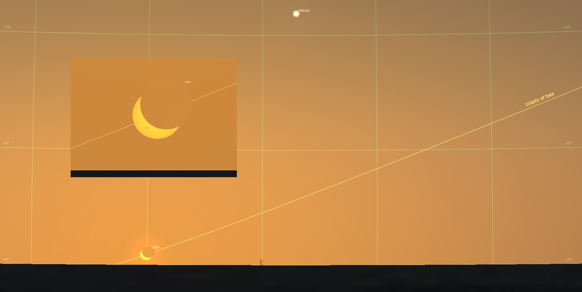 You'll want to start and be set up before local sunrise. Can you spy Venus? Shining at -4.1 magnitude, you should be able to follow brilliant Venus right up into the daytime sky. Fresh off of inferior conjunction on March 23rd, Venus is 13 degrees west of the Sun during the eclipse.