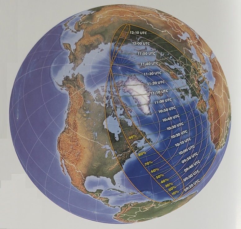 Mid-eclipse occurs around 10:47 UT high in the Canadian Arctic, and the eclipse departs the Earth over remote northern Russia at 12:44 UT. Sites through Europe and Africa will see the eclipse transpire in its entirety.