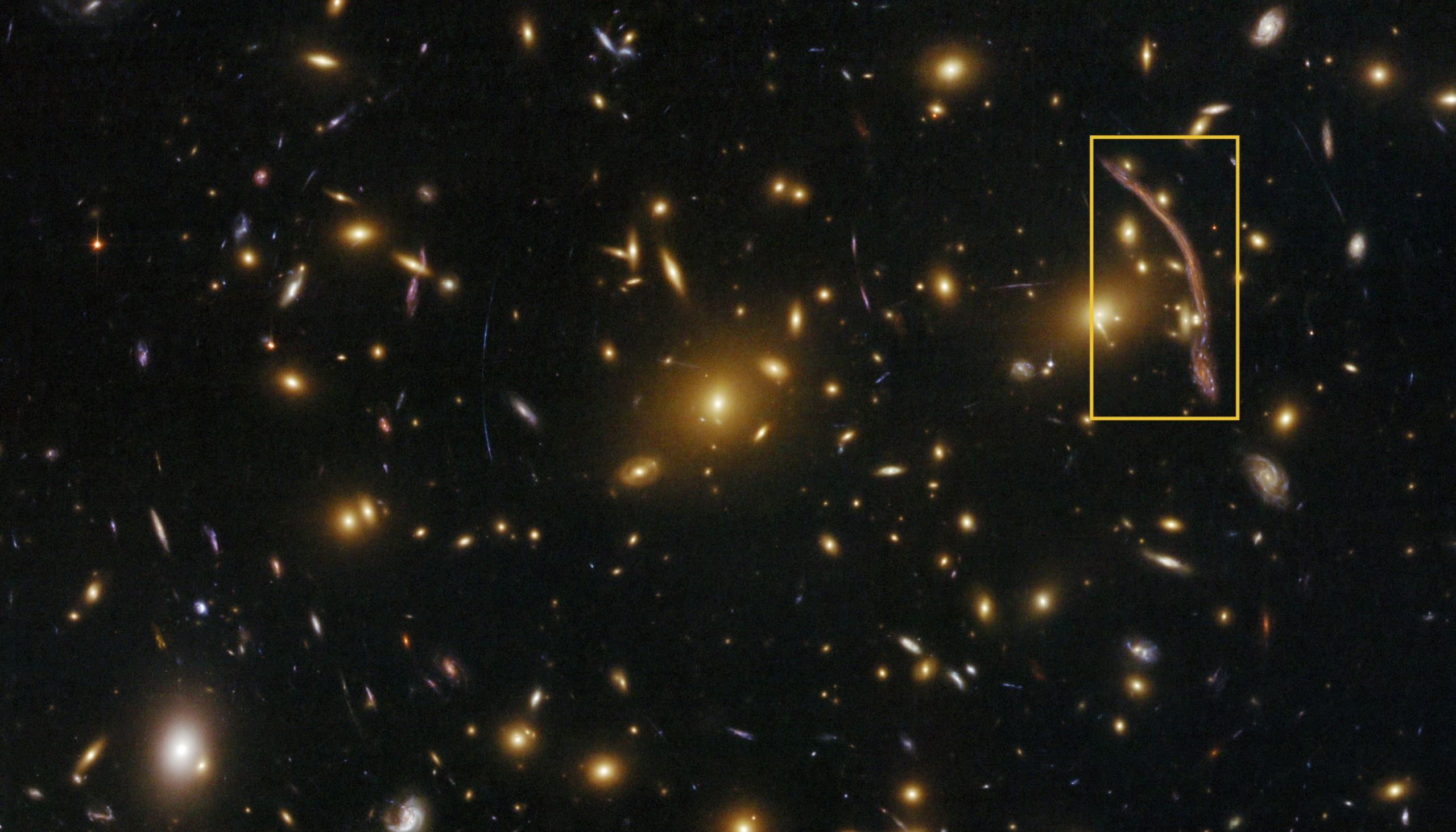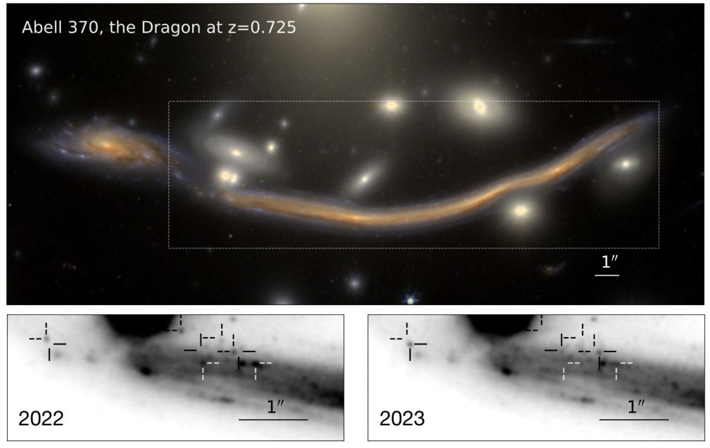 The results are published in Nature Astronomy*, and they focus on JWST observations of a cluster of galaxies known as Abell 370. This galactic cluster is famous because it acts as a gravitational lens for more distant galaxies behind it. You can see them as arcs of light in the image above. One prominent arc, highlighted in the image, is known as The Dragon*. It is made up of the lensed and magnified images of several galaxies, the light of which has traveled 5 to 7 billion years to reach us.