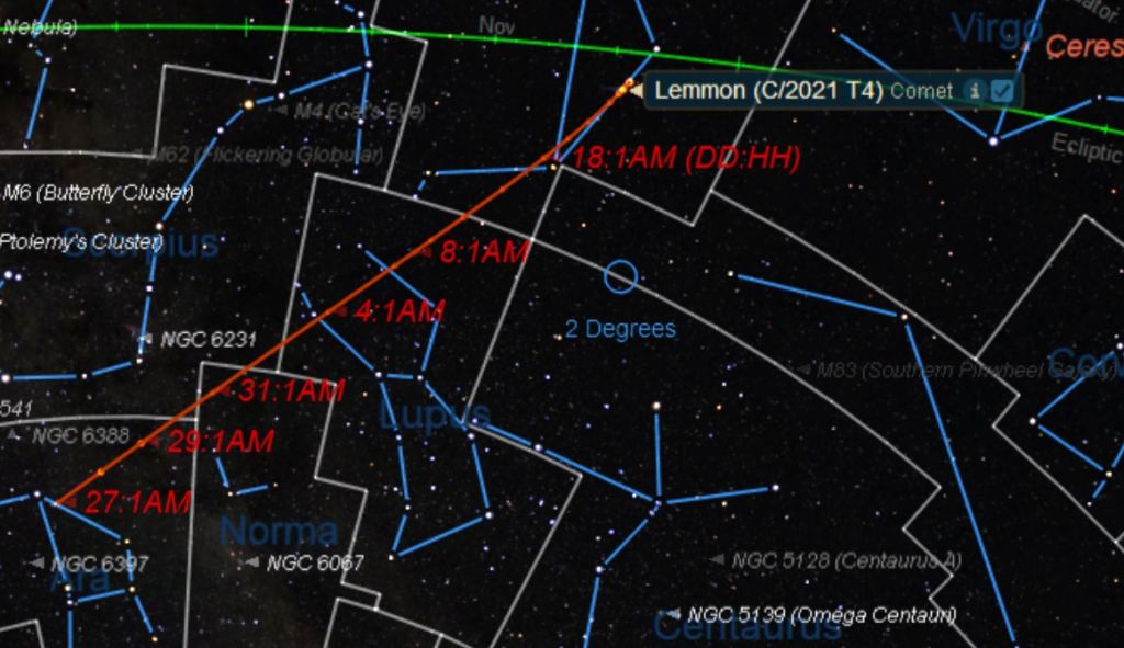 Here's quick rundown on celestial dates with destiny for Comet T4 Lemmon over the next few months. Unless otherwise noted, 'near' for the following list means less than a degree away:
