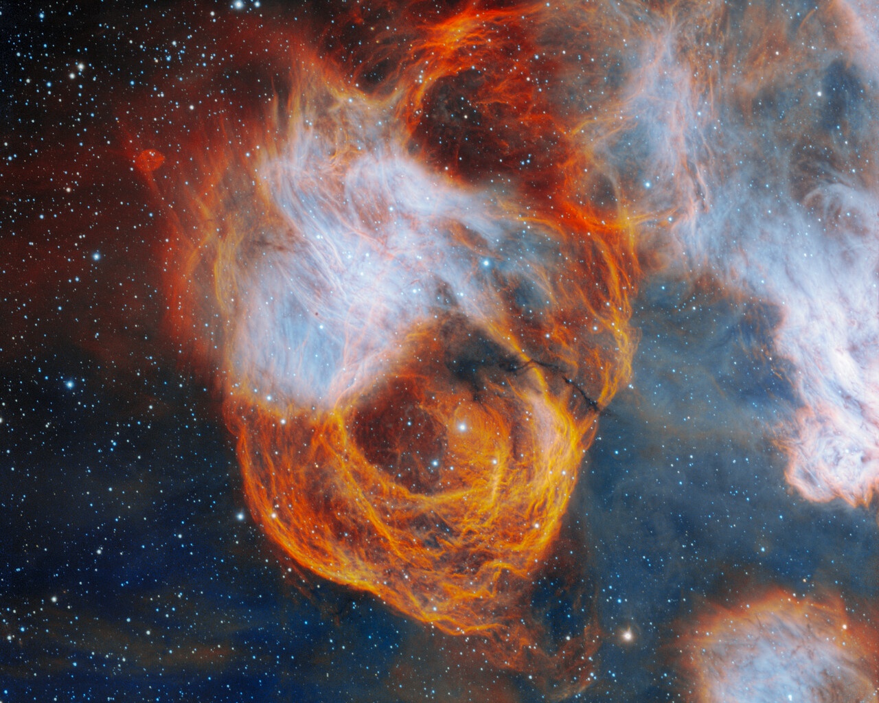 Human eyes can never see something like this naturally. The light spans wavelengths from the ultraviolet to the optical to the infrared. Instead, the Gemini South telescope captures the light at wavelengths beyond our range. The telescope employs filters to manage the light, showing us the deep red and orange colours from hydrogen and the light blue of oxygen. Bright white regions are abundant in both. It's a nice partnership between telescope technology and human vision.
