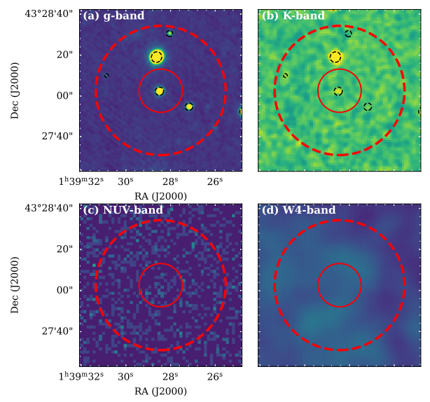 All galaxies are made of mostly dark matter. The visible matter, like stars, gas and dust, makes up only a small percentage of a galaxy's mass. But galaxies like this one, named FAST J0139+4328, are even more extreme, and its low luminosity suggests there are no stars, only clouds of gas. The astronomers who discovered it say the galaxy is "without any optical counterpart."