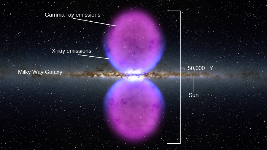 Closer to home, our own Milky Way's black hole, shows evidence of quasar activity even within the last few million years. Known as the "Fermi Bubbles", two enormous bubbles of gamma and X-ray radiation emanate from the core of our galaxy stretching 50,000 light years perpendicular to the galactic plane. Radiating outward at nearly a thousand km per second, the bubbles may be the result of our supermassive black hole's feasting upon a cloud of interstellar gas millions of years ago. That period is over now, but the energy released is still travelling through space and is visible to our telescopes - an echo of our own awoken monster's howl.