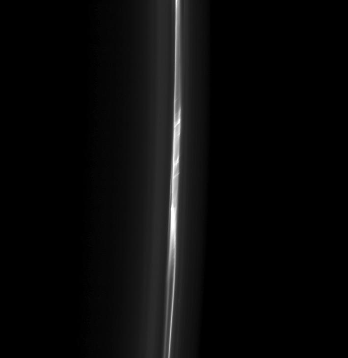 Made of particles of water ice finer than cigarette smoke, the F ring orbits Saturn beyond the outer edge of the A ring across the expanse of the 2,600-km-wide Roche Division. In these images, Saturn and the main ring systems are off frame to the left.