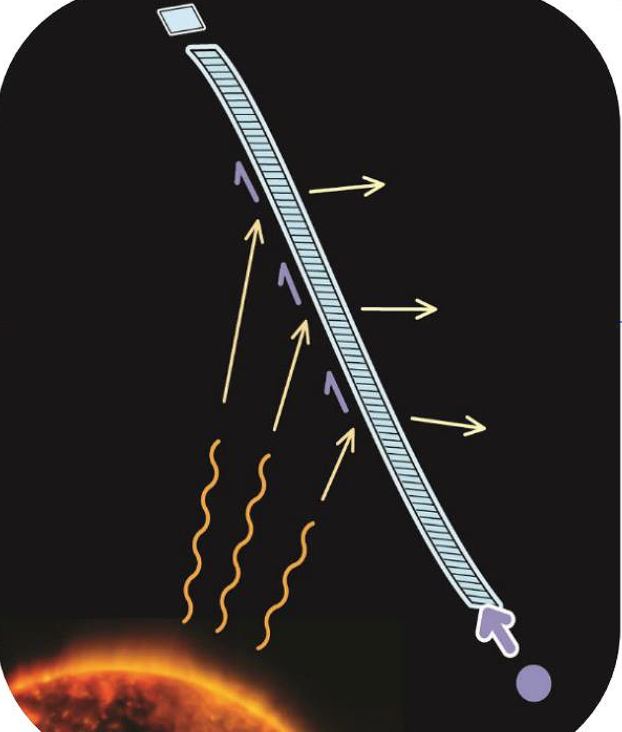 The diffractive grating is the key here - when the Ribbon is oriented towards the light from the Sun, the light effectively "pushes" it, just like a solar sail. But, in this case, the diffractive grating causes the force to be directed toward the "leading end" of the Ribbon. Importantly, it does this with no structure components at all - just the Ribbon itself.