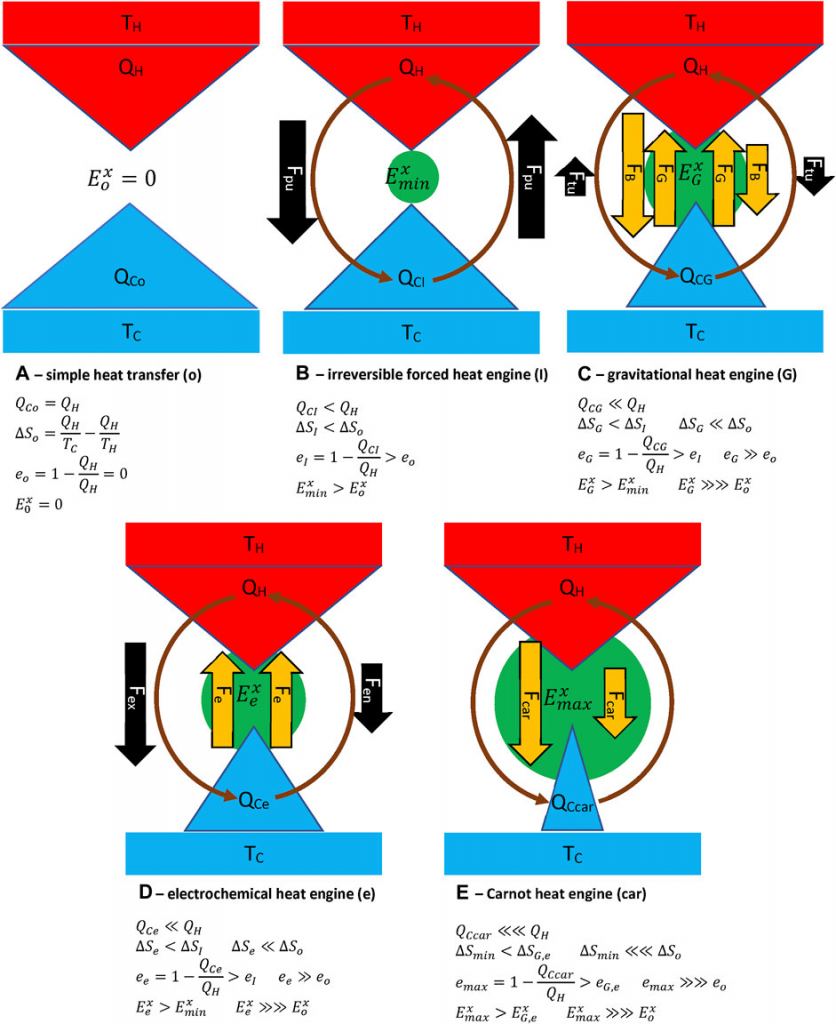 "[T]hat human life and all Earth life evolved from ongoing solar power pouring down on Earth and a build-up of exergy (stored energy) in the form of networks of dissipative structures (biochemical cycles of lifeforms) that the life is now dependent on. The theory is also based on modeling these dissipative structures as well as those of geophysical cycles (e.g., water, air, and weather cycles) as heat engines and applying what we know in classical mechanics of conservative forces that make these heat engines self-restoring."