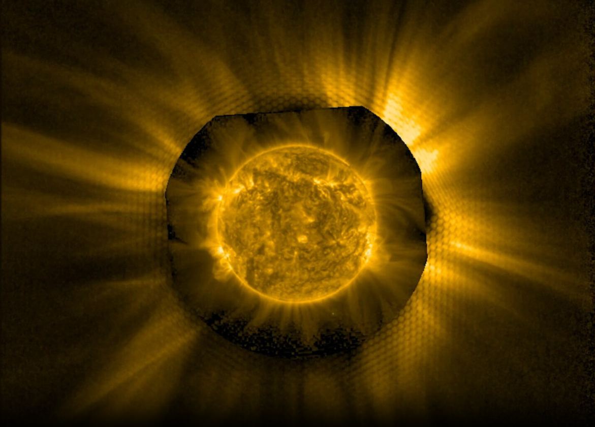 This movie shows an ultraviolet image of the Sun's corona taken using the EUI occulter. An ultraviolet image of the Sun's disc has been superimposed in the middle, in the area left blank by the occulter. The image of the Sun's disc is from NASA's STEREO mission, which happened to be looking at the Sun from almost the same direction as the Solar Orbiter at the same time. Image Credit: ESA & NASA/Solar Orbiter/EUI Team; F. Auchère et al (2023); Solar disc: NASA/STEREOAuchère's little addition to the EUI's instrument door solves a problem that plagues extreme UV imagers. The depths of the Sun's atmosphere are beyond the view of most of them, and traditional separate coronagraphs usually totally block this region out of necessity. But the EUI's new occulter can more easily image this difficult region than ever before.