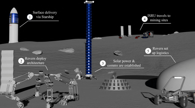 First would be the delivery method to get there—like much of the overall Artemis project, THEIA would rely on delivery from a SpaceX Starship. The team calculated the initial launch requirements to get a basic setup up and running to be around 73 tons, well below the threshold of 100 tons the rocket is expected to be able to carry to the lunar surface.