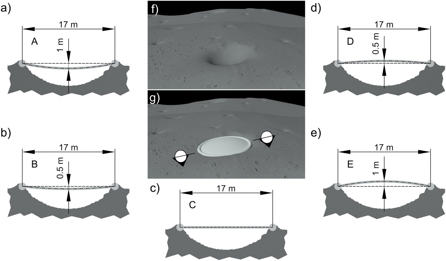 The authors analysed the concept of a covering lid for their hypothetical lunar crater, which measures 17 meters (~56 ft) in diameter and 6 meters (~20 ft) in depth. This is consistent with craters in the Mare Tranquillitatis region, which average about 20 meters by 8 meters (65.5 by 26.25 ft). The next step was to conduct a numerical analysis to identify the appropriate dimensions and shapes for a lunar structure that could handle the load transfers and maintain an Earth-like atmospheric pressure (1,013.25 millibars or 1 bar) within. The next step was to select building materials that could handle the internal stress distributions and be produced on-site using local resources.