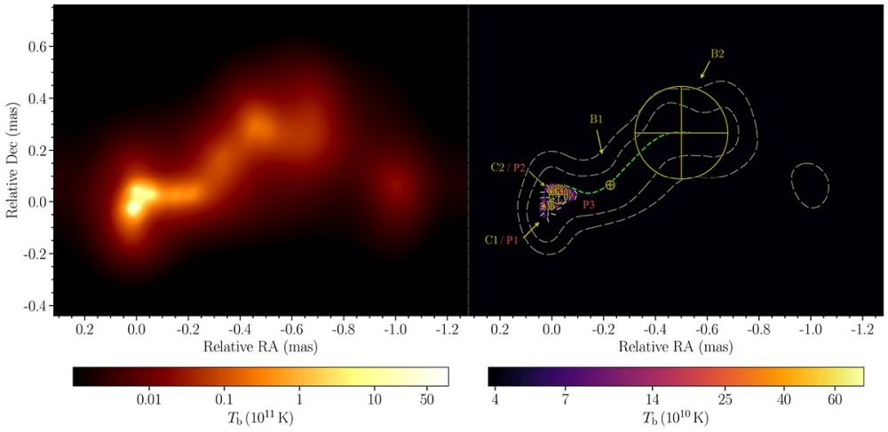 *These images of OJ 287 are from April 25, 2016. The image on the left shows brightness temperature. The image on the right shows total intensity contours. P1, P2, and P3 are polarized features, and the central dashed green curve traces the jet ridgeline. Yellow circles C1 and C2 mark the locations of the black holes. Image Credit: Traianou et al. 2025. A&A*