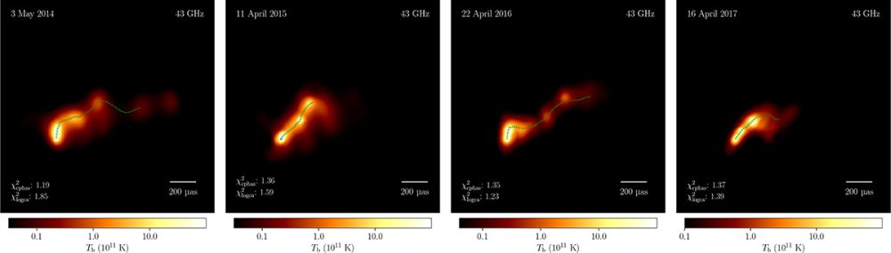 *These are multi-epoch VLBI images of OJ 287 observed on May 3, 2014, April 11, 2015, April 22, 2016, and April 16, 2017. The ridgelines, delineating the jet’s axis for each epoch, are overlaid as dashed lime lines, with a black outline for enhanced visibility. This image sequence clearly shows the jet’s evolution over the four years. Image Credit: Traianou et al. 2025. A&A*