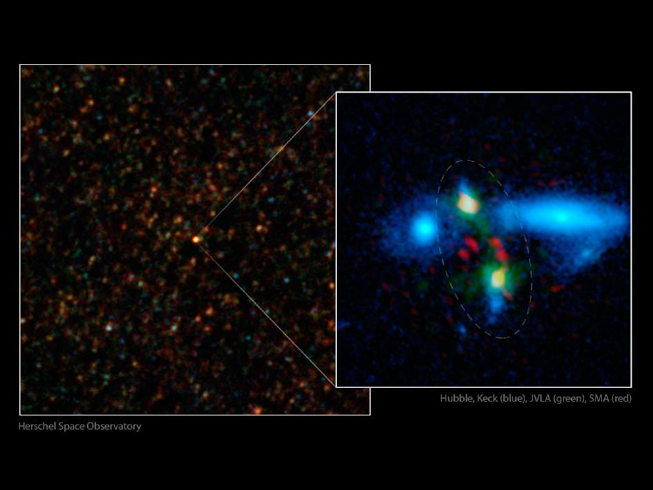 "These merging galaxies are bursting with new stars and completely hidden by dust," said co-author Asantha Cooray, also of the University of California at Irvine. "Without Herschel's far-infrared detectors, we wouldn't have been able to see through the dust to the action taking place behind."