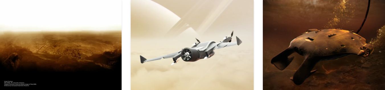 Surface of Titan (left) with modeling mockups of the Mayfly (middle) and Manta (right).