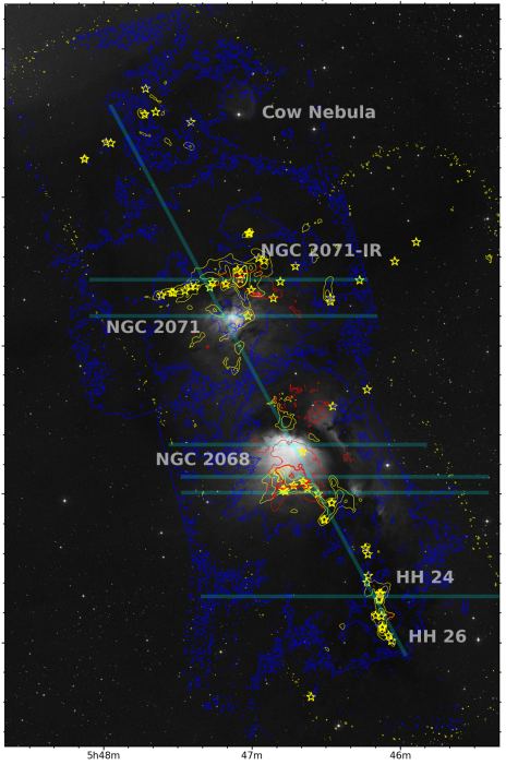 The Orion cloud complex is hundreds of light-years across and between 1300 and 1600 light-years away. It's one of the most active star-forming regions that we can see with the naked eye and holds the closest molecular clouds to the Sun. It contains young, newly-born stars with protoplanetary disks, emission nebulae and reflection nebulae, dark nebulae, and other features. For these reasons, it's an often-studied area of the sky, an irresistible lure for intellectually curious astronomers and astrophysicists.