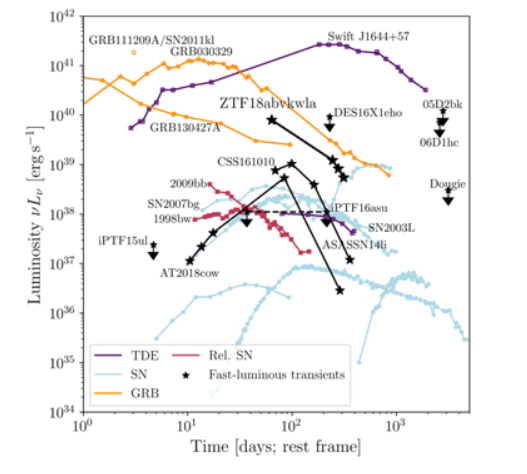 Two other stellar explosions, one in 2016 and one in 2018, also caught the eye of the astronomy community for similar reasons. They were called CSS161010 and ZTF18abvkwla ("The Koala"). The Koala showed extremely bright radio emissions, as bright as a gamma-ray burst (GRB). And CSS161010 ejected an abnormal amount of material into space, at half the speed of light.