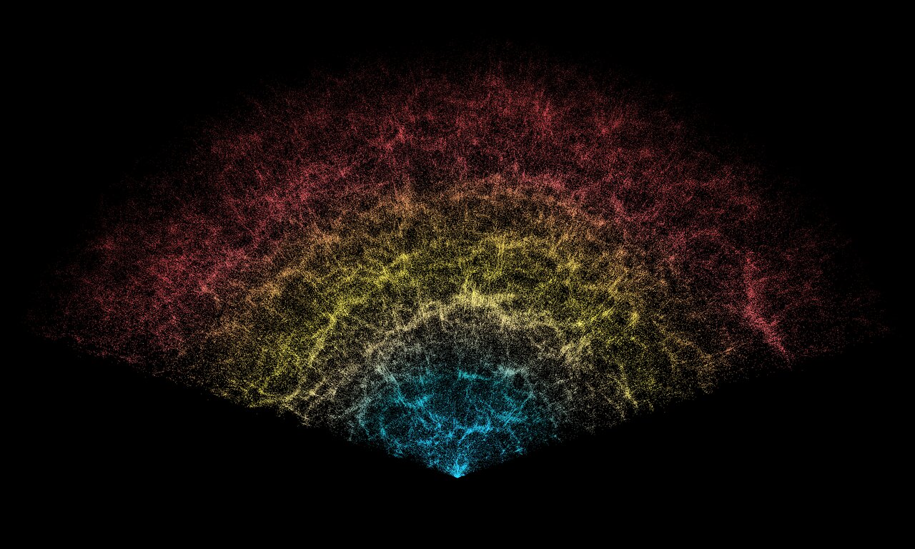 As the Universe cooled and expanded, the density waves froze their ripples in place, and where density was high, galaxies eventually formed. The ripple pattern of the BAO is visible in the DESI leading image. It shows strands of galaxies, or galaxy filaments, clustered together. They're separated by voids where density is much lower.