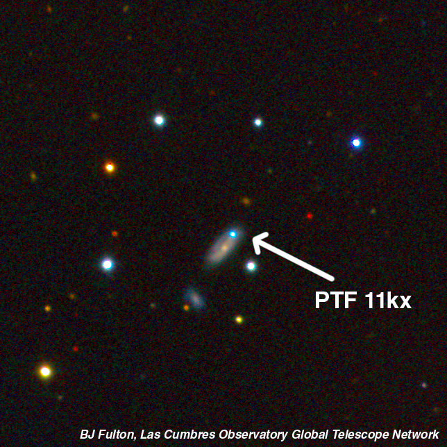 The initial observations of PTF 11kx were made possible by a robotic telescope mounted on the 48-inch Samuel Oschin Telescope at California's Palomar Observatory as well as a high-speed data pipeline provided by the NSF, NASA and Department of Energy. The supernova was identified on January 16, 2011 and supported by subsequent spectrography data from Lick Observatory, followed up by immediate "emergency" observations with the Keck Telescope in Hawaii.