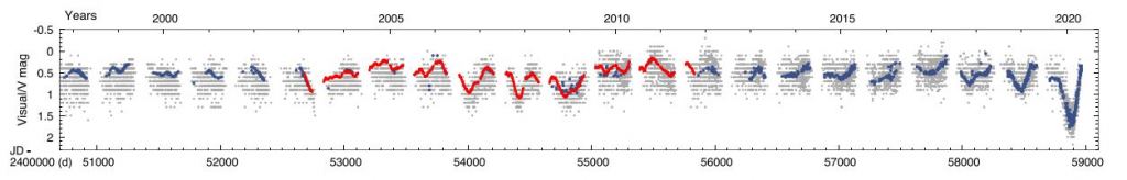 With all the new information about Betelgeuse, we still have a mystery. What caused the dimming event in late 2019? If Betelgeuse still has millennia before its magnificent death what happened? Two possible answers: The combination of multiple modes of variability in Betelgeuse aligned to enhance the dimming of the usual variability. Like dropping multiple stones into a pond, sometimes the waves can merge to create larger waves, or actually cancel eachother out. We may have witnessed that kind of event. Or, another likely cause, a massive cloud of dust moved between us and Betelgeuse temporarily blocking some of the star's light - an extrinsic rather than intrinsic dimming event.