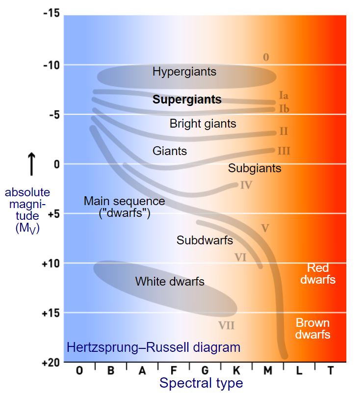 As a Red Giant, the star's position on the HR Diagram moves to one of the "giants" families that grow as branching stems off the "S" of the Main Sequence. It is now brighter (higher on the Y axis) and redder (farther right on the X axis). This is how we might distinguish say a class M Red Dwarf from a Class M Red Giant. A red dwarf and red giant may occupy the same position on the X axis colour-wise, but the giant will be much brighter and therefore higher on the Y axis in the one of the giant branches. Red Supergaints like Betelgeuse are in the final stages of their lives. That doesn't necessarily mean they've lived a long life – just that they are in the final stages of their own life. Betelgeuse has lived a fraction of our Sun's lifetime despite being much more massive. One would think larger star = more fuel to burn but larger stars are burning the candle at both ends. To maintain balance against their enormous mass they burn through hydrogen much faster than their lower mass counterparts.