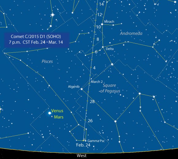 Newly-named Comet C/2015 D1 (SOHO) will share the sky with Venus and Mars at dusk. For the next few nights it will be quite low and nearly impossible to see. Its situation improves over time as the comet moves rapidly northward into Pegasus and Andromeda. Tick marks show the comet's position each evening. Stars are shown to magnitude +6.5. Created with Chris Marriott's SkyMap software[/caption]