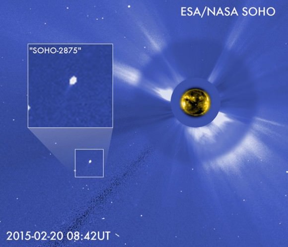 C/2015 D1 (SOHO) seen in a second, wide-field coronograph called LASCO C3 at 2:42 a.m. Feb. 20. Since then it's well to the east of the Sun into the evening sky. Credit: NASA/ESA[/caption]