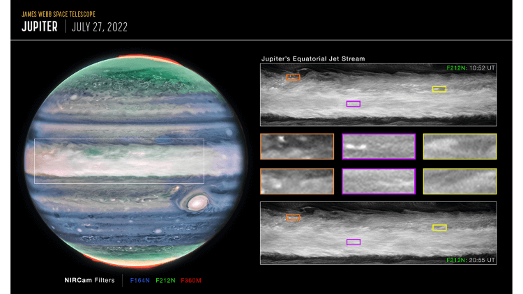 While JWST made its observations within Jupiter's high altitudes, the team used NASA's Hubble Space Telescope to make observations in lower altitudes just one day later, which helped the team estimate changes in wind speeds with respective to altitude within the clouds, also known as wind shears. While they found the jet stream of 515 kilometers per hour (320 miles per hour) higher in the clouds, these wind speeds decreased as the altitude decreased, with speeds of 362 kilometers per hour (225 miles per hour) and 402 kilometers per hour (250 miles per hour) occurring only a few miles lower in Jupiter's massive atmosphere. Essentially, the team of astronomers briefly played the role of meteorologists as they analyzed and calculated Jupiter's weather patterns.