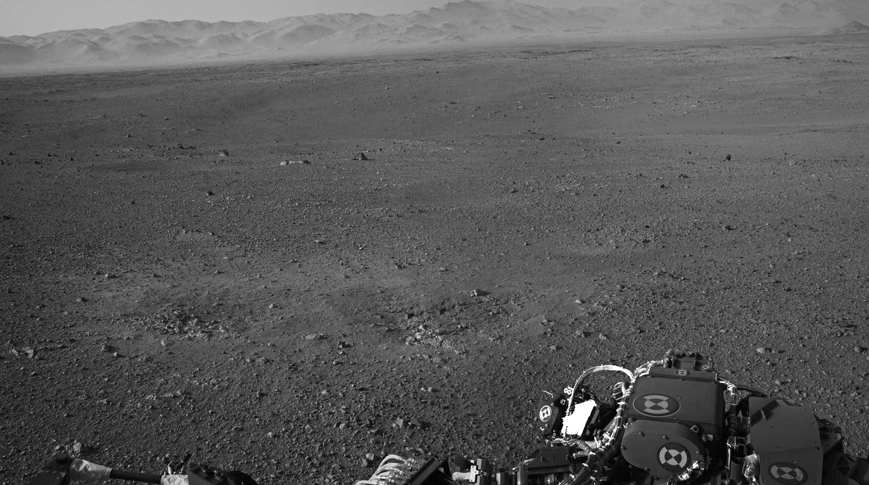 Taken this morning (mission Sol 2) with the rover's left Navcam, here's a high-res panorama of Curiosity's view at its landing site within Gale crater. The wide-angle view was assembled from two separate raw images, so while the mountainous rim of the crater is lined up horizontally there's some distortion in alignment of objects closer to the rover due to the angle of the Navcam lens. Still, it's a very cool view of Curiosity's surroundings!